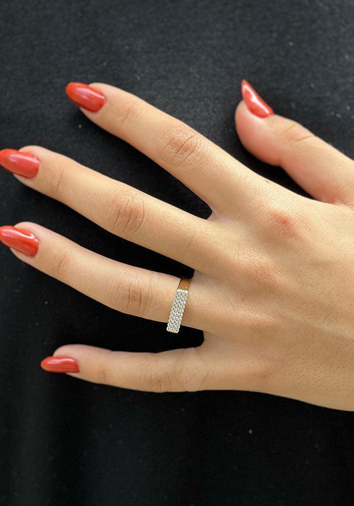 Bague plate en forme de rectangle avec trois rangs pavés de strass blancs.