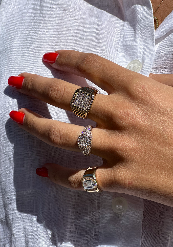 La bague Solea est une bague chevalière en plaqué or jaune, ornée d’un strass rectangulaire taille émeraude, mis en valeur par un serti octogonal pavé de zirconiums et une monture épaisse au caractère affirmé.