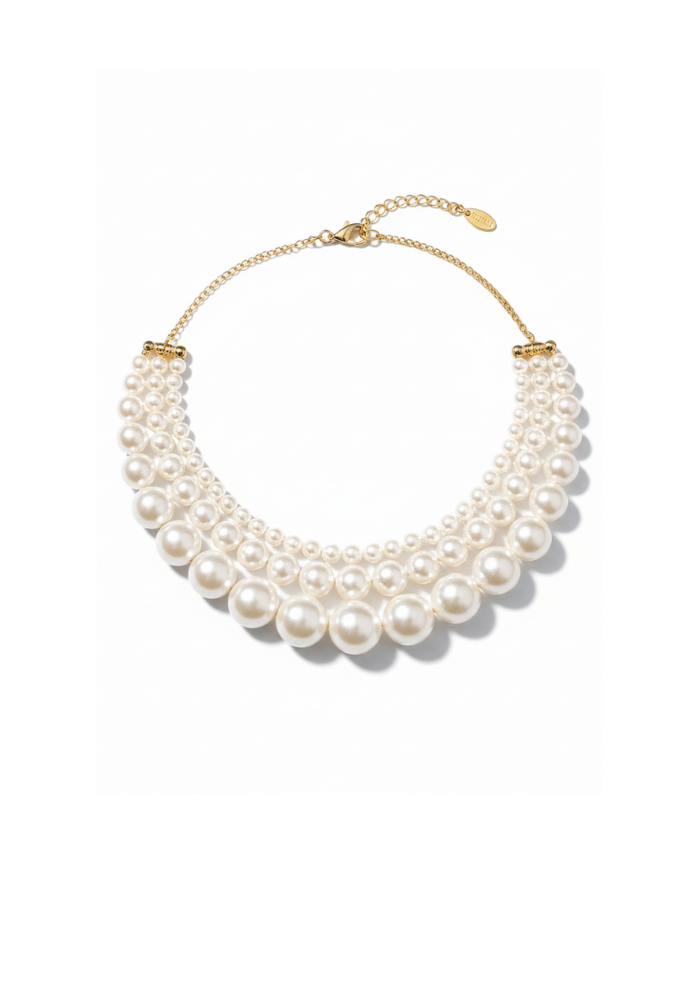 Bijou de col plastron avec plusieurs rangs de perles de tailles différentes. Il vient se placer sous le col d'une chemise, comme une cravate décorative.