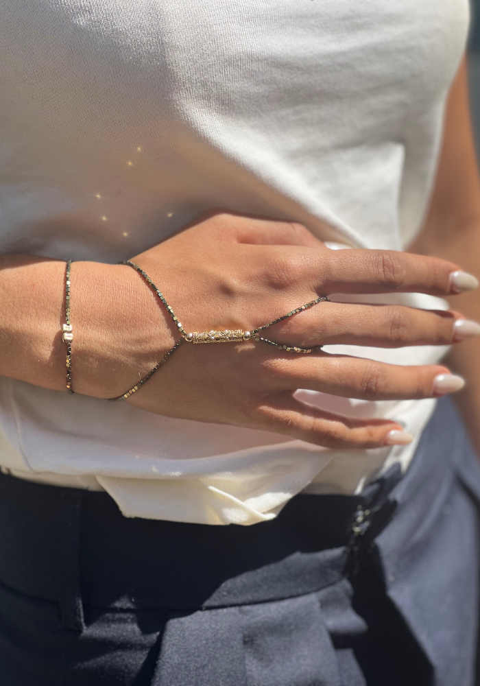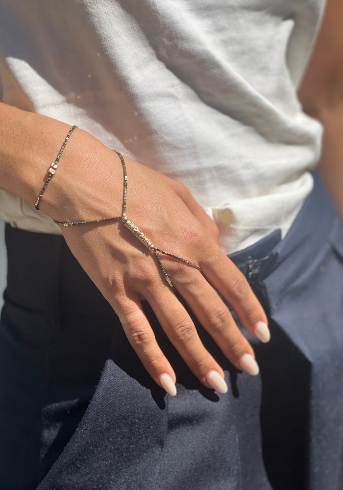 Bijou de main Dany 2 tours avec des hématites carrées et une pièce en forme de tube à motifs en plaqué or jaune. Ce tube est entouré de deux petites boules en plaqué or jaune.