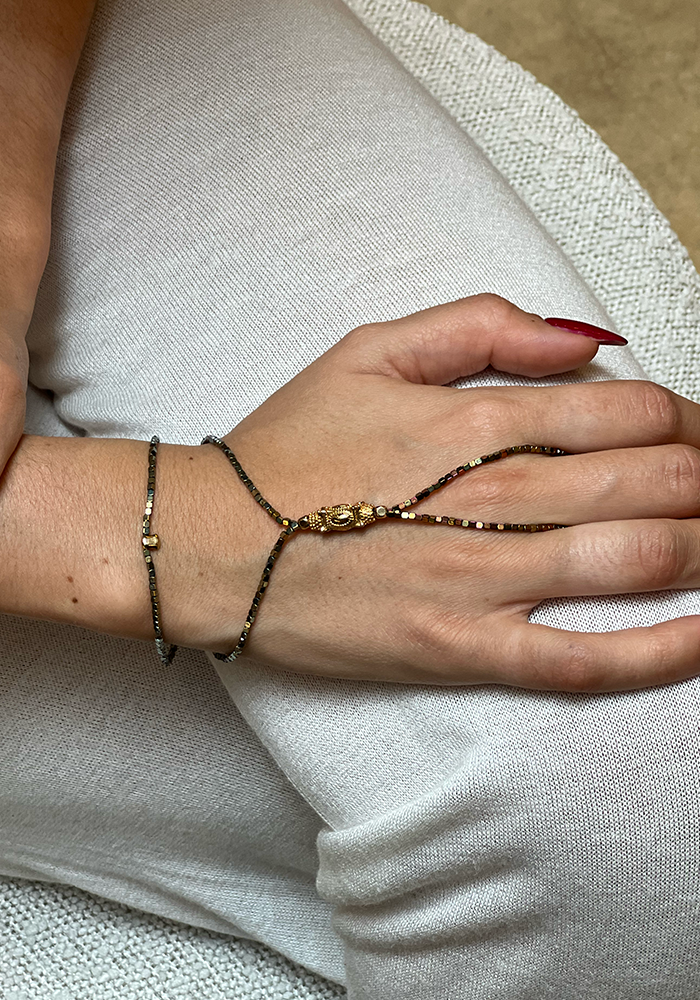 Bijou de main Paul 2 tours avec des hématites carrées et une pièce en plaqué or jaune.