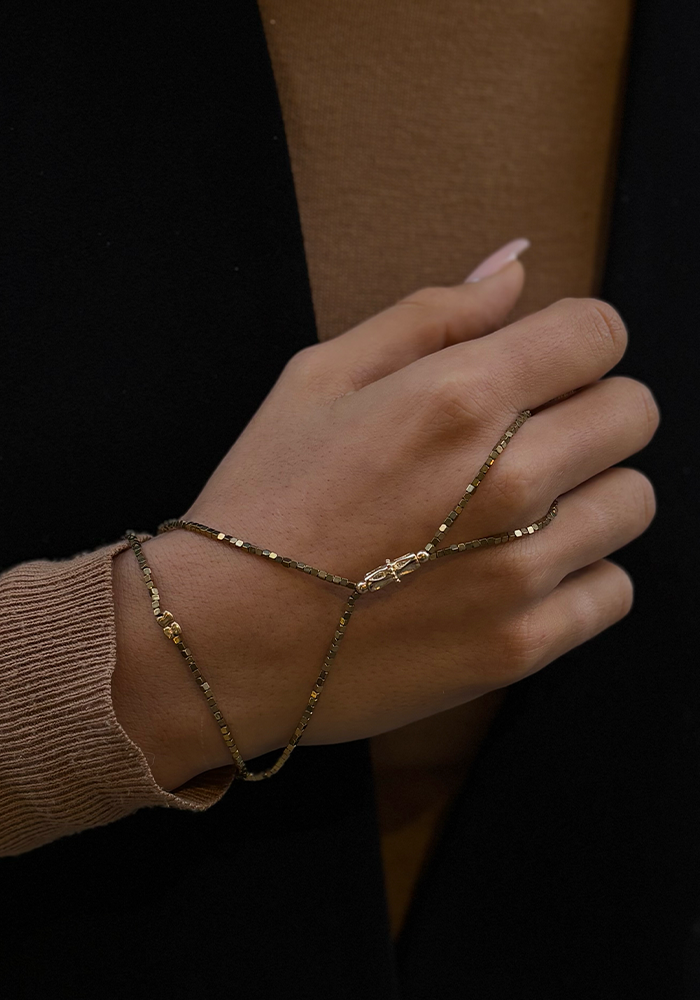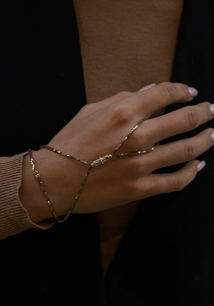 Bijou de main Manon à 2 tours, composé d'hématites carrées, d'un tube gravé de gouttes et encerclé de deux boules.