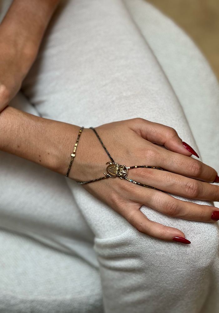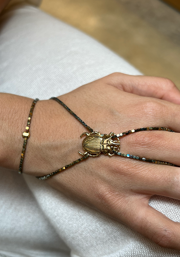 Bijou de main Paul 2 tours avec des hématites carrées et une pièce en forme de scarabée en plaqué or jaune.