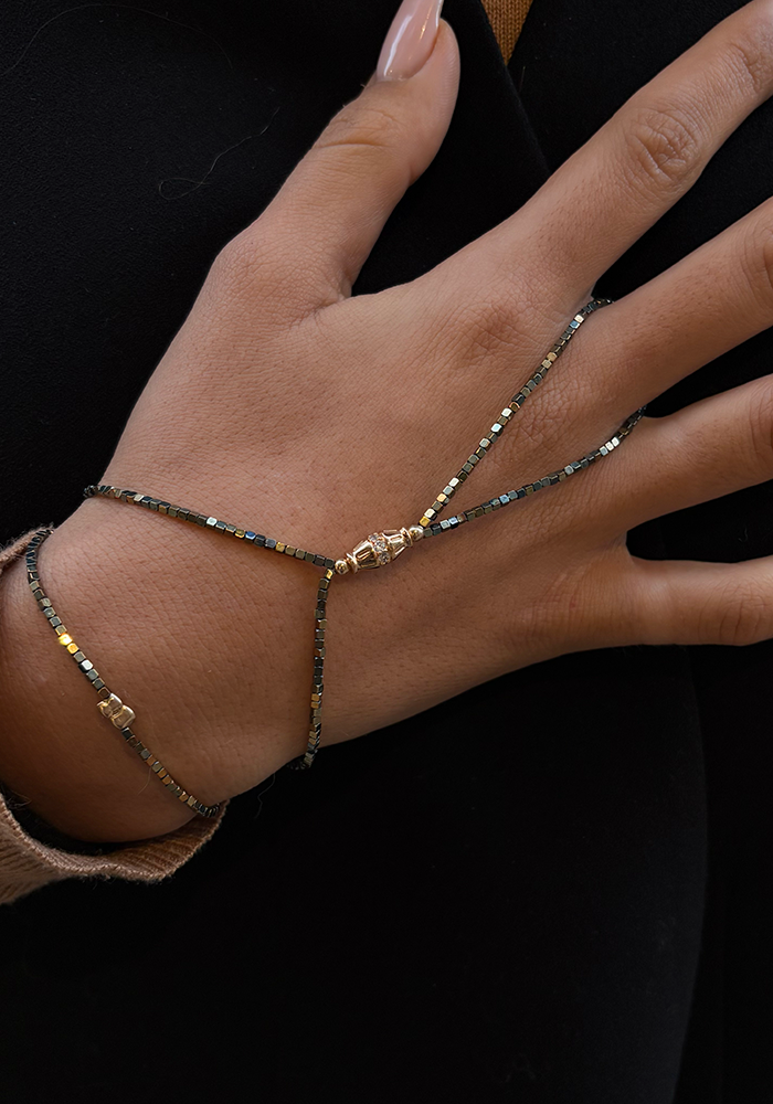 Bijou de main Sally 2 tours avec des hématites carrées et une pièce en forme de toupie à motifs en plaqué or jaune. Cette toupie est dispose d'une bande ornée de petits zircons.