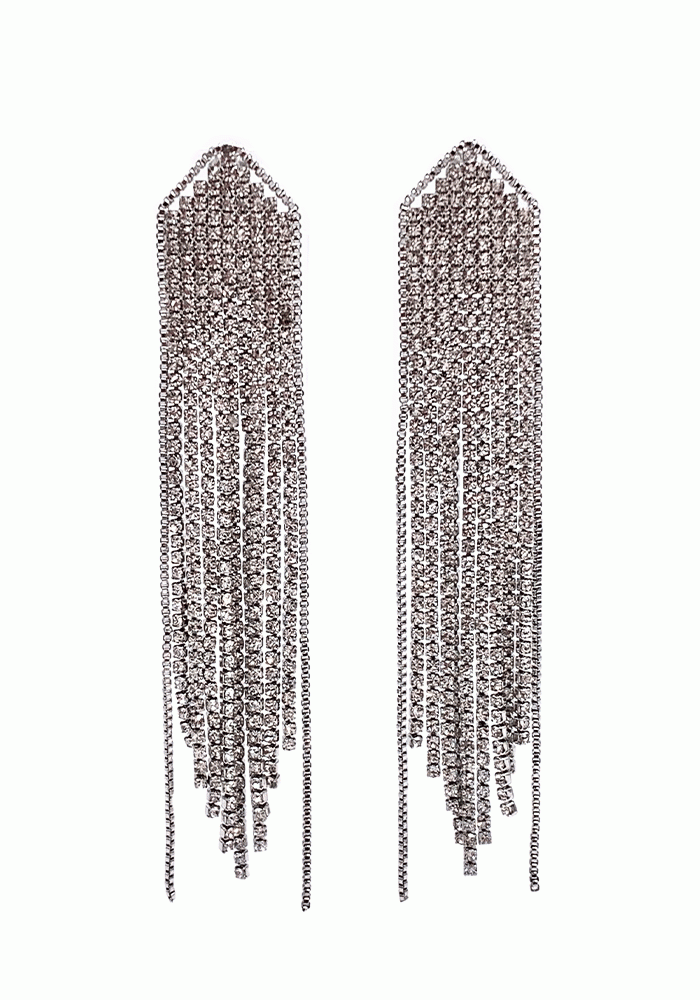 Boucles d'oreilles en pointe avec des franges pavées de strass et entourée d'une chaine articulée.
