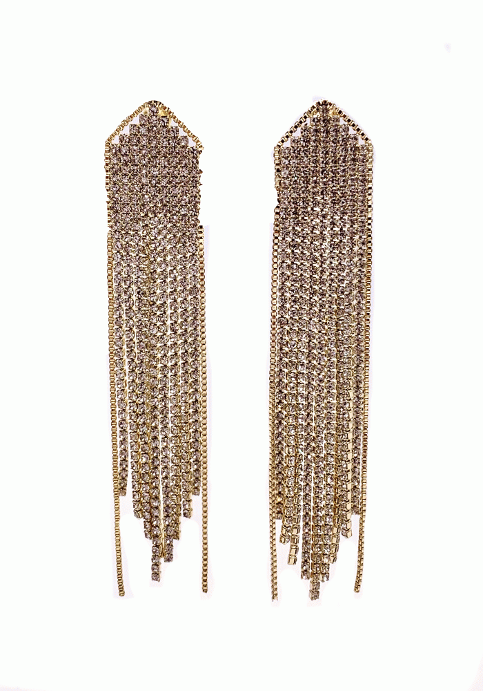 Boucles d'oreilles en pointe avec des franges pavées de strass et entourée d'une chaine articulée.