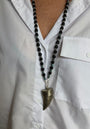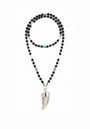 Le collier Guy est un collier long en argent, composé de perles en hématites noires et de turquoise, rehaussé d’un pendentif corne au design affirmé.