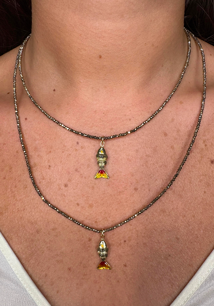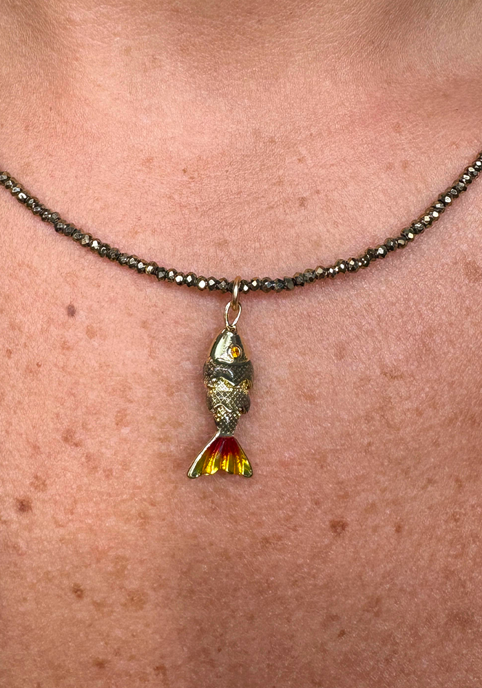 Ce collier artisanal est composé d'hématites. Il est orné d’un pendentif poisson émaillé doré avec la queue coloré, symbole de chance, d’abondance et de liberté.