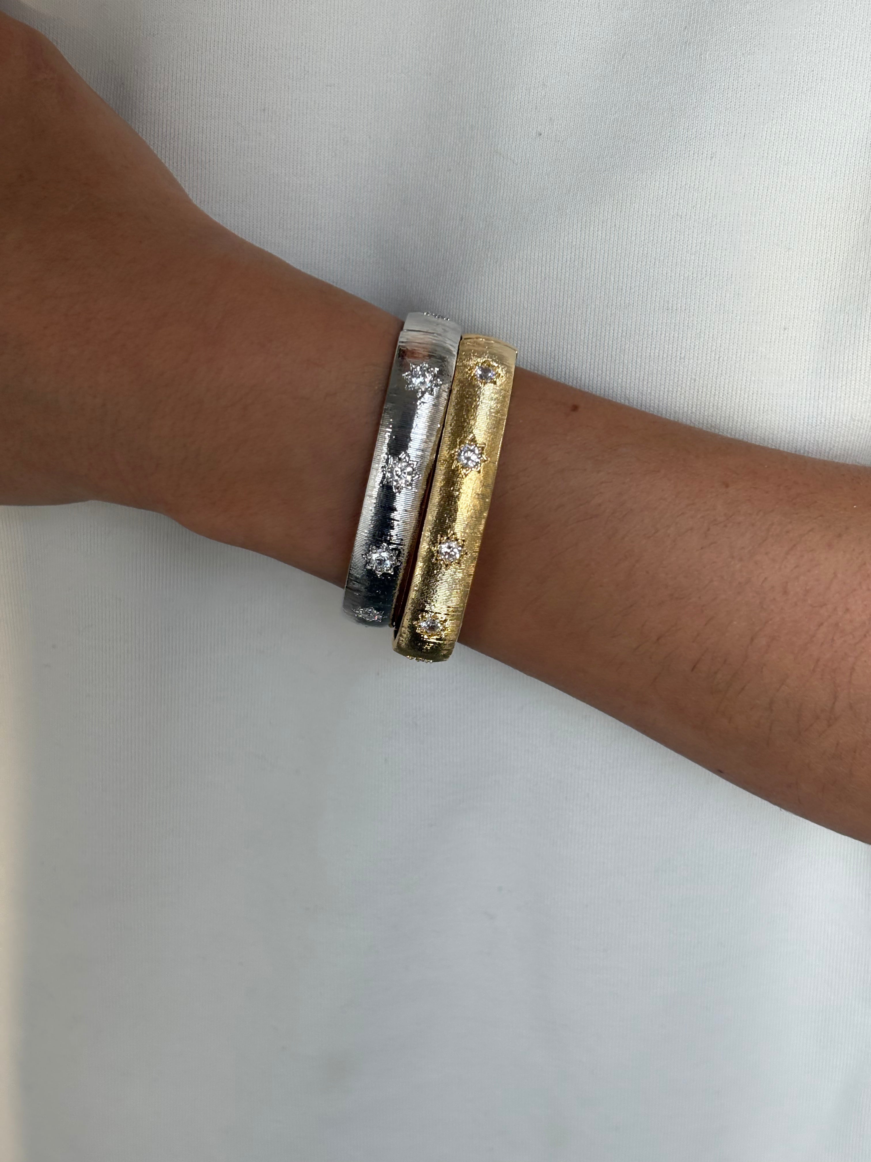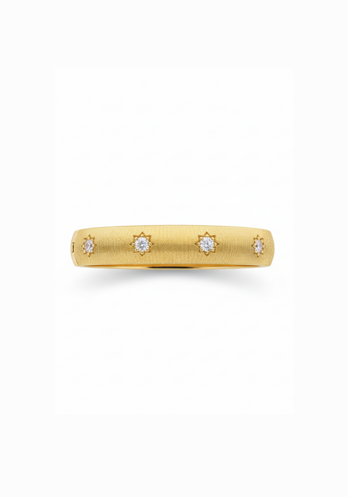 Bracelet manchette fermé orné de motifs étoiles délicatement gravés, avec une finition texturée.