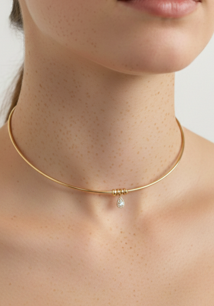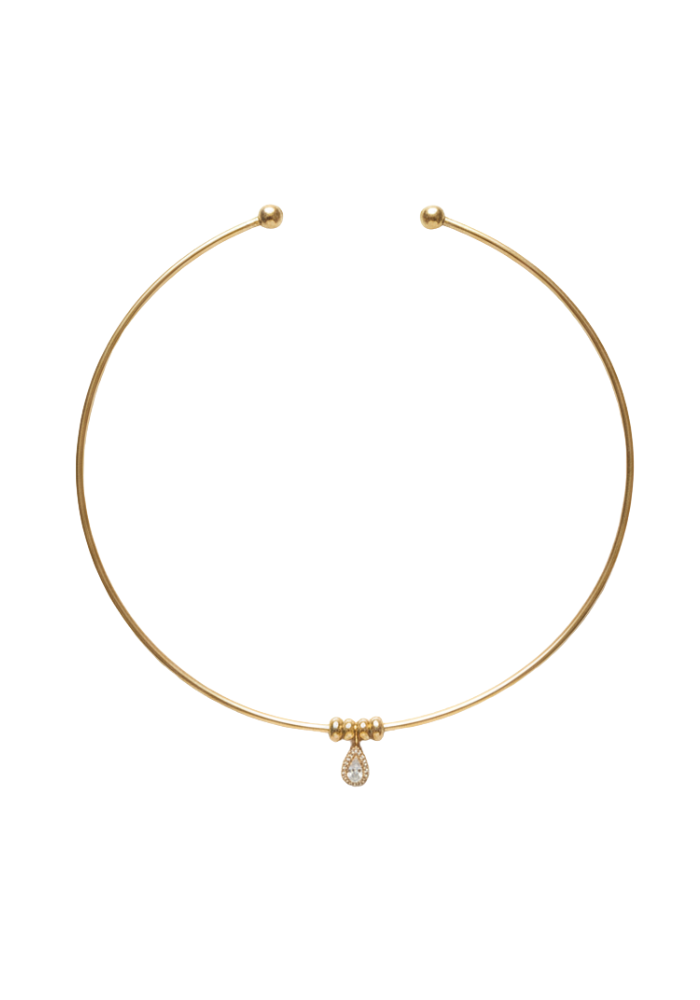 Le collier Torque Sonia est un torque ouvert rigide doré à l’or fin, orné en son centre d’un pendentif goutte serti de zirconiums, minimaliste et élégant pour un porté quotidien ou en soirée.